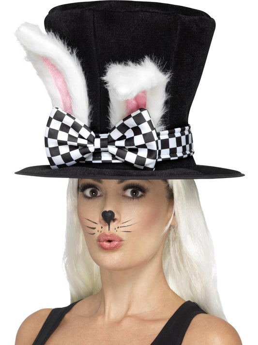 • Disfraz de liebre de marzo, blanco y negro, con sombrero de copa con orejas de conejo pegadas, guantes, pajarita y cola