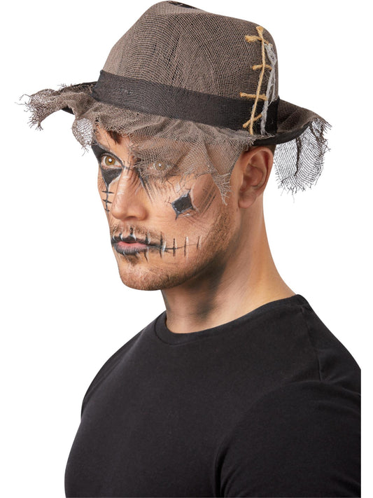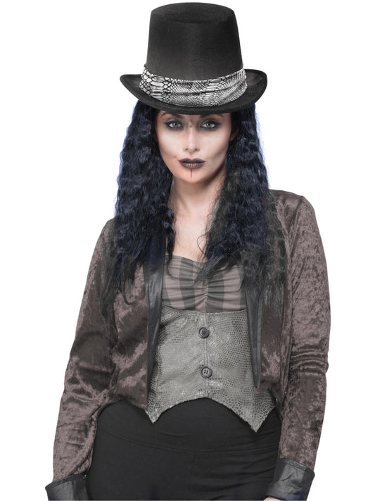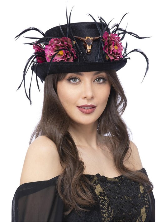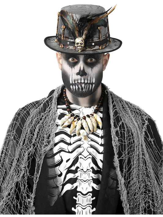 Sombrero de copa negro desgastado de médico brujo, con huesos y plumas