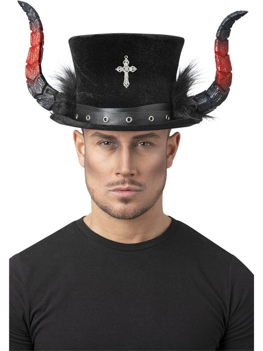 Sombrero de copa con flores y cuernos, negro y rosa, con peonias y plumas