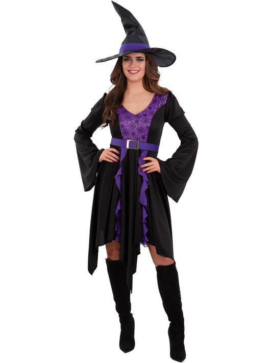 Disfraz de bruja horripilante, Negro, con vestido, cinturón y sombrero