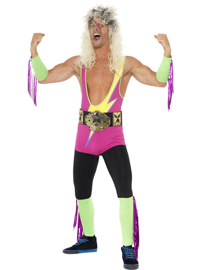Retro Wrestler Costume, Multi-Coloured with Bodysuit, Belt, Arm & Leg Cuffs
