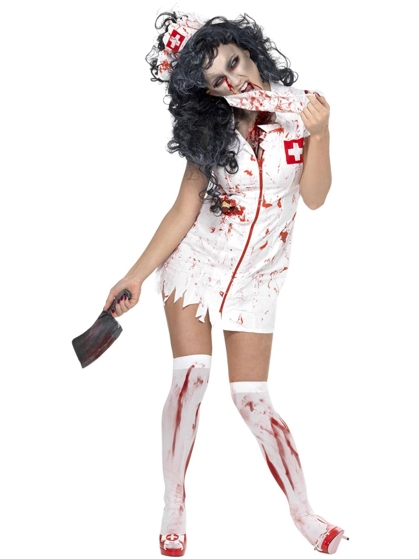 Zombie Nurse Costume, White Dress with Latex Wound, Mask & Headpiece