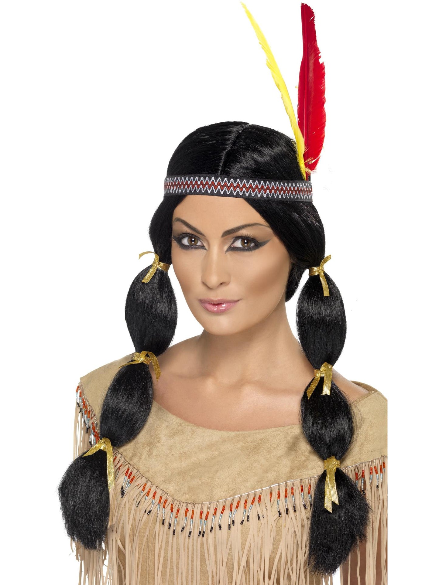 Peluca inspirado por los americanos nativos, negro, con coletas y cinta para la cabeza