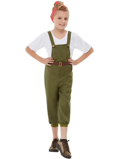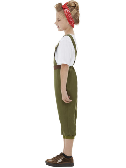 WW2 Little Land Girl Costume, Green with Top, Dungarees & Headscarf