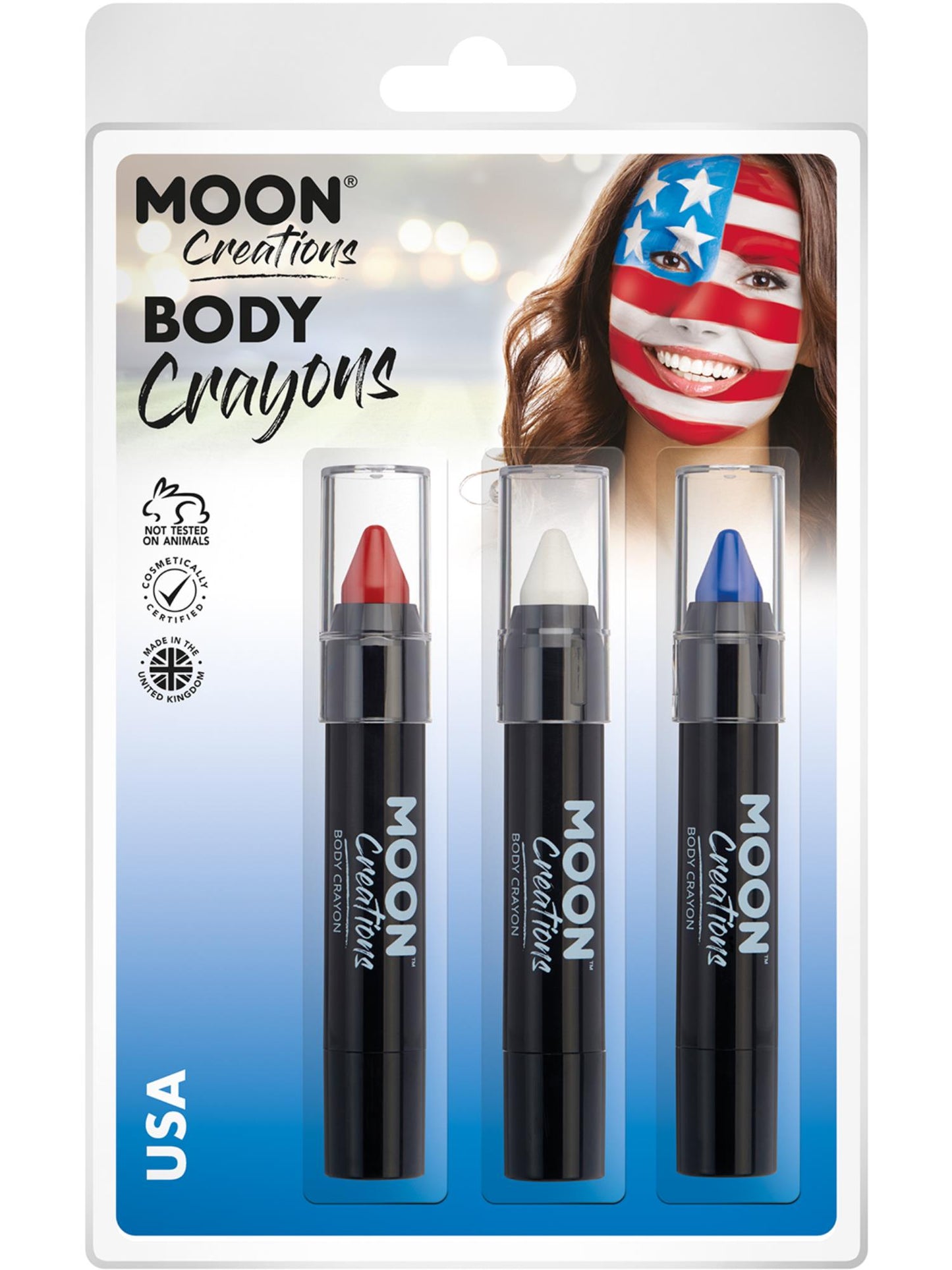 Moon Creations Body Crayons, 3.2g Clamshell, USA - Red, White, Dark Blue