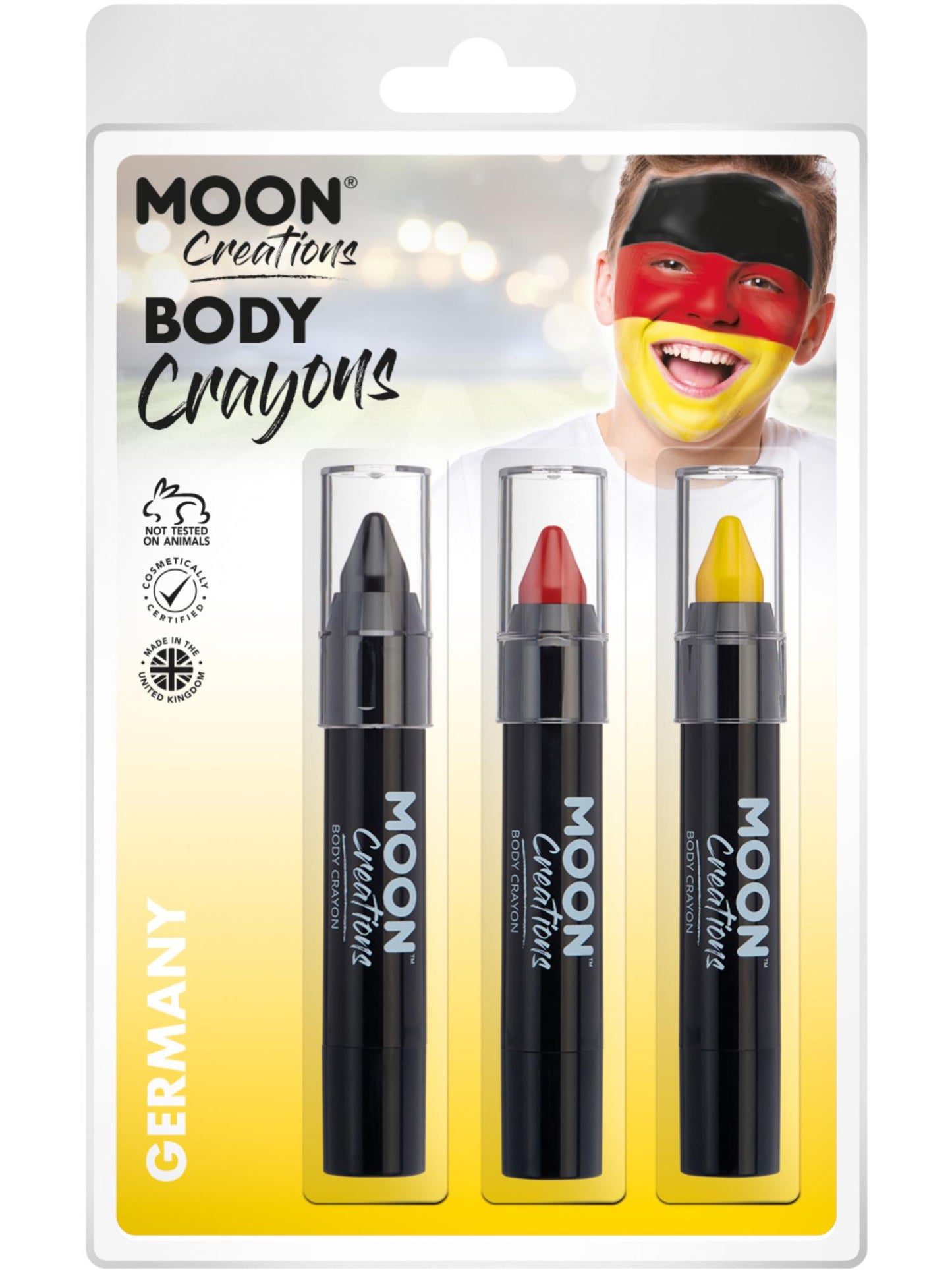Moon Creations Body Crayons, 3.2g Clamshell, Germany - Black, Red, Yellow