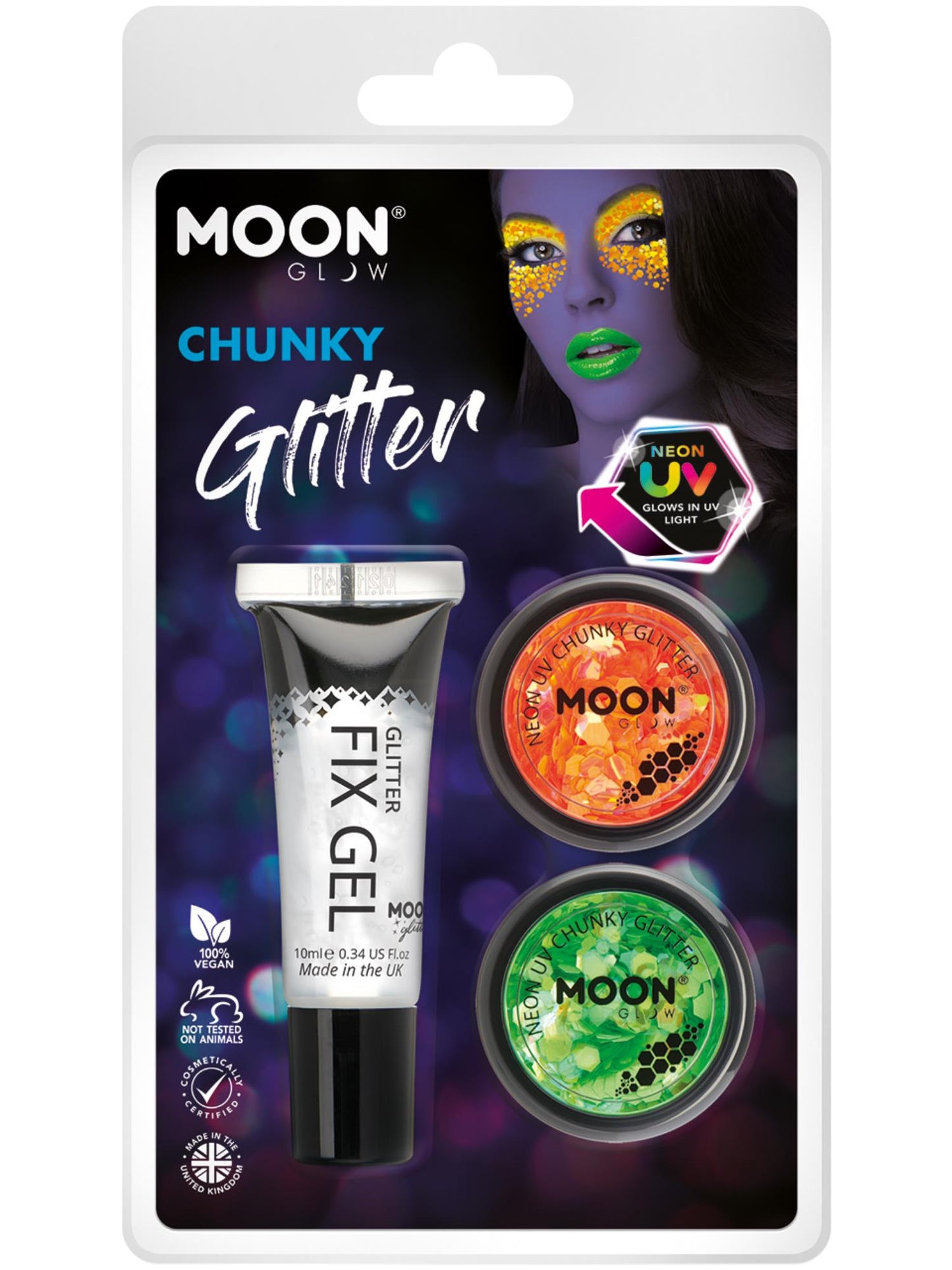 Moon Glow - Neon UV Chunky Glitter, 3g Clamshell - Fix Gel, Orange, Green