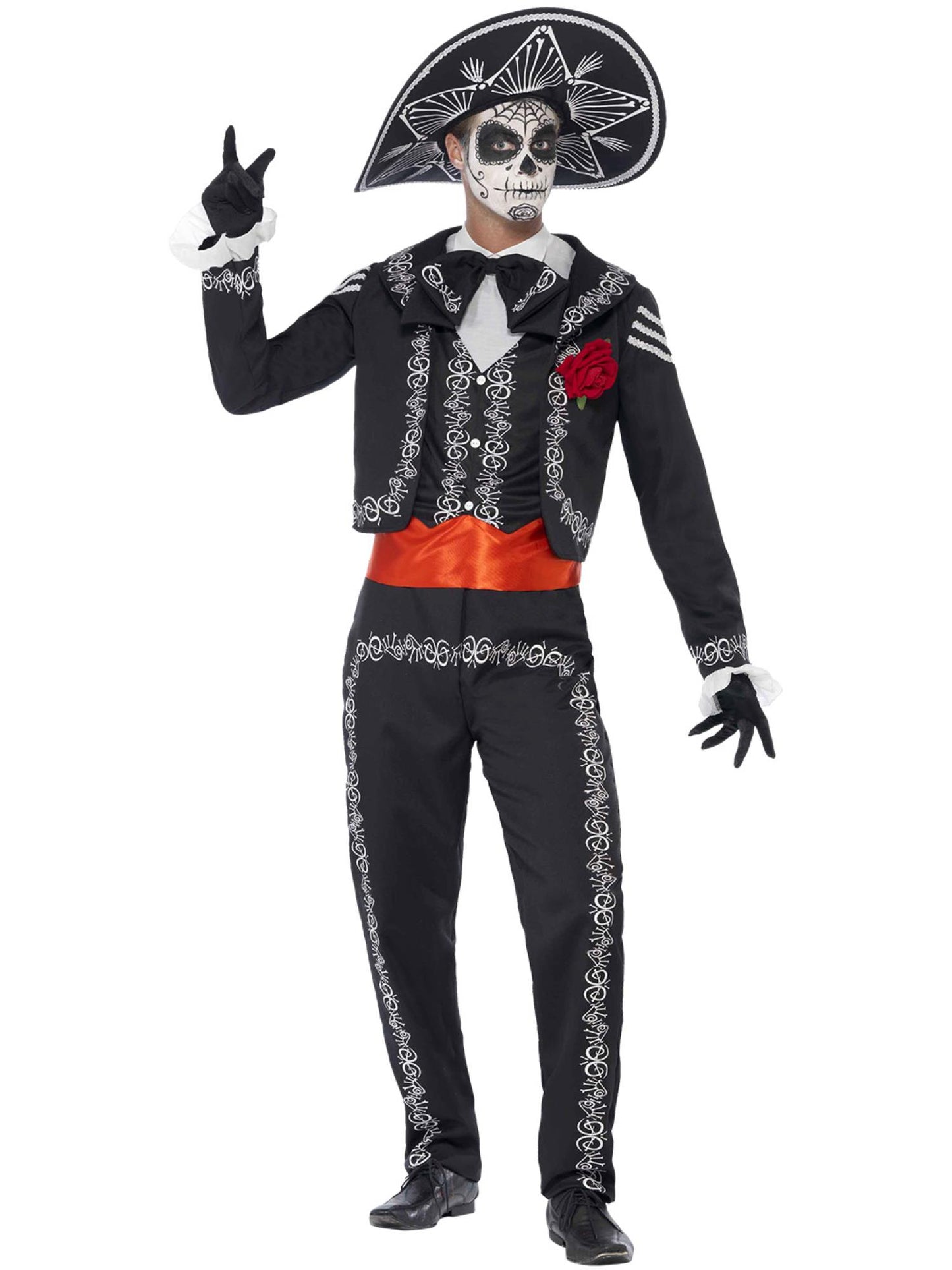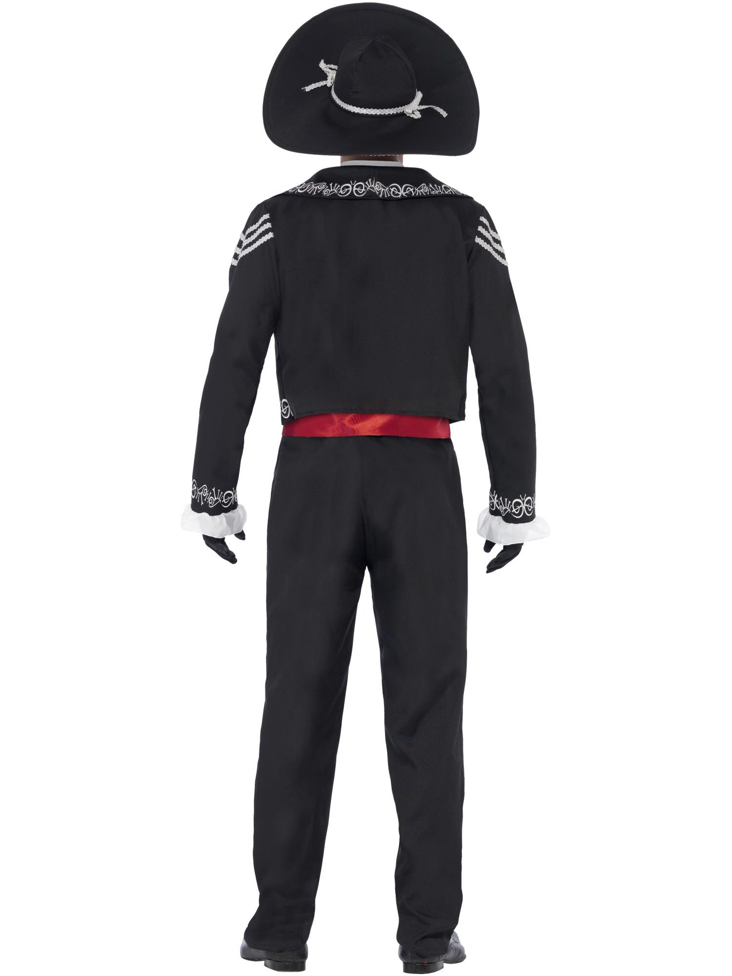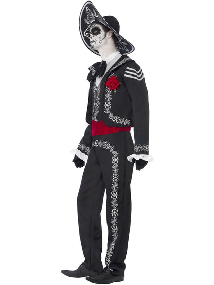 Deluxe Day of the Dead Señor Bones Costume, Black with Jacket, Trousers, Mock Shirt & Hat