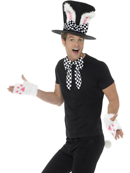 Tea Party March Hare Kit, Black & White Top Hat, Rabbit Ears, Gloves, Bow Tie & Tail