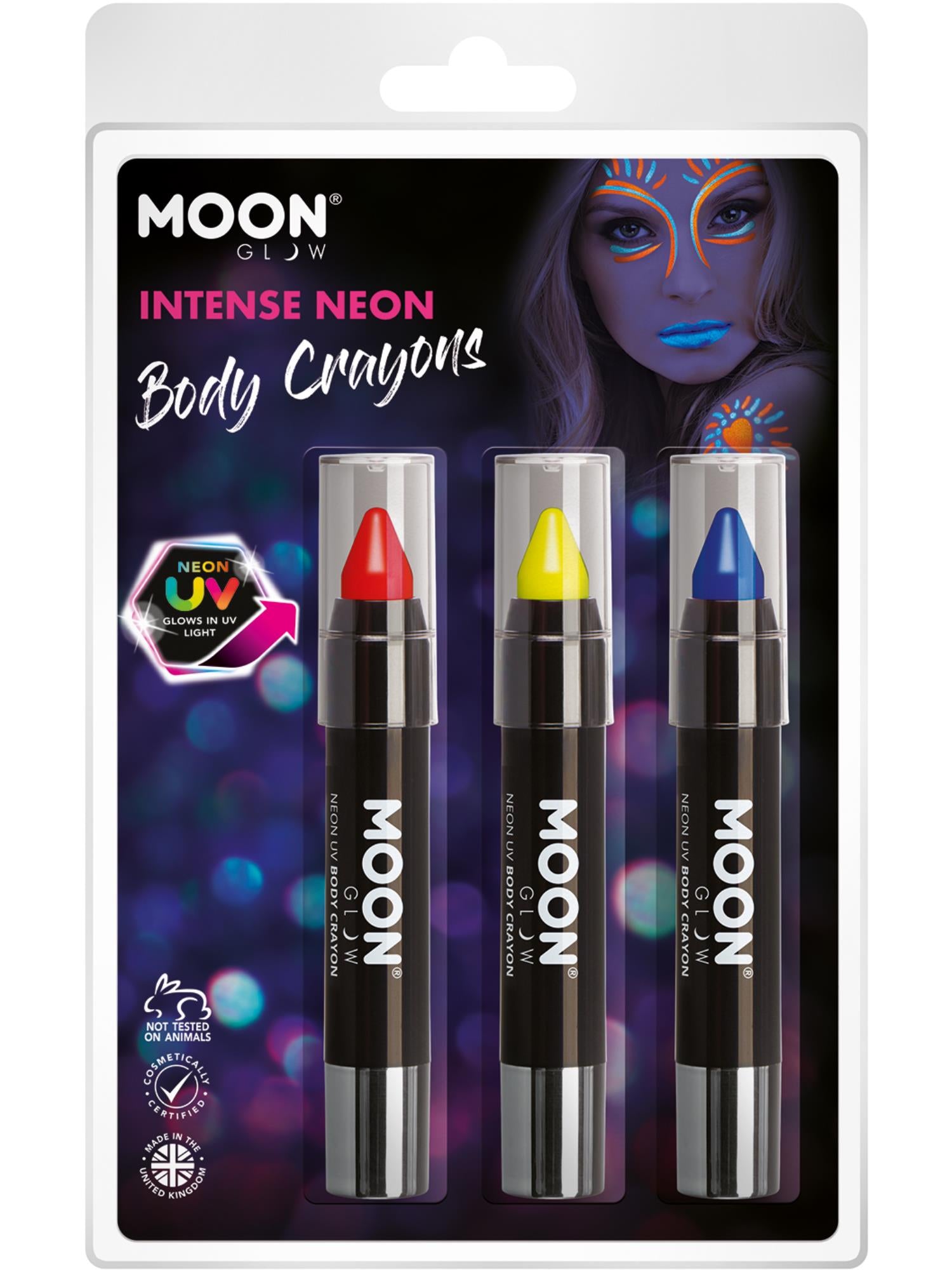 Moon Glow Intense Neon UV Body Crayons, Clamshell, 3.2g - Red, Yellow, Purple
