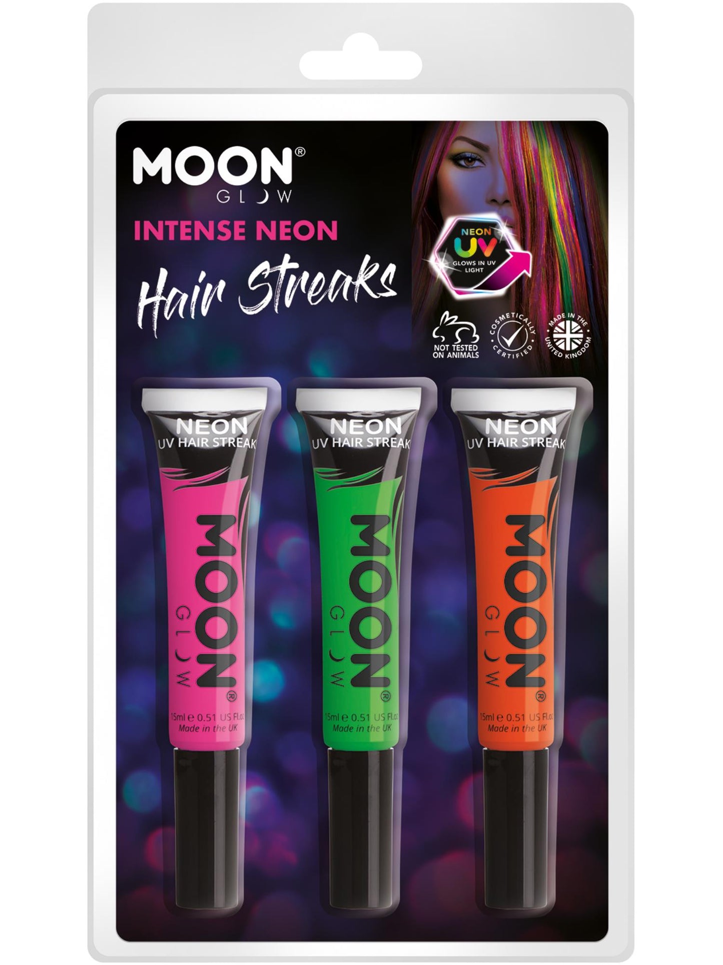 Moon Glow Intense Neon UV Hair Streaks, Clamshell, 15ml - Pink, Green, Orange